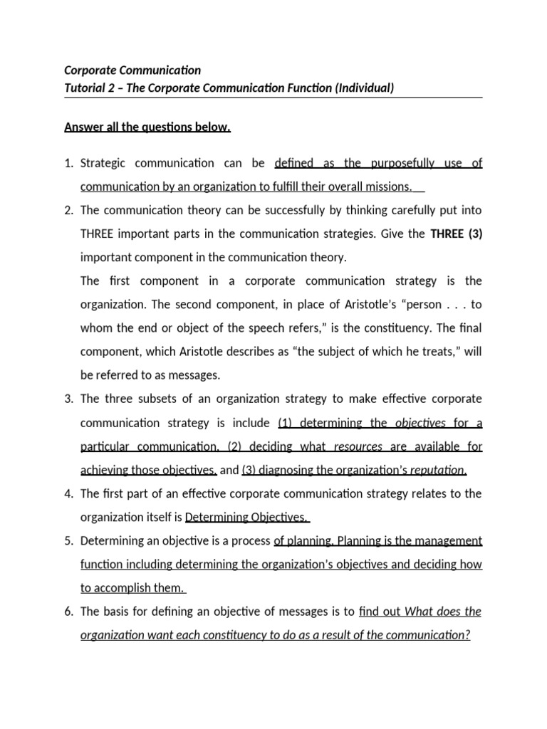 Tutorial 2 – The Corporate Communication Function (Individual)