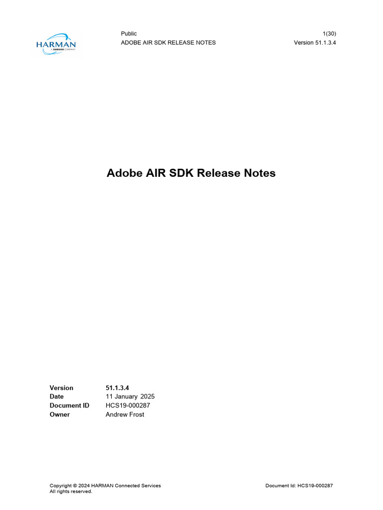 This release shall be delivered via the AIR SDK website: https://airsdk.harman.com/download