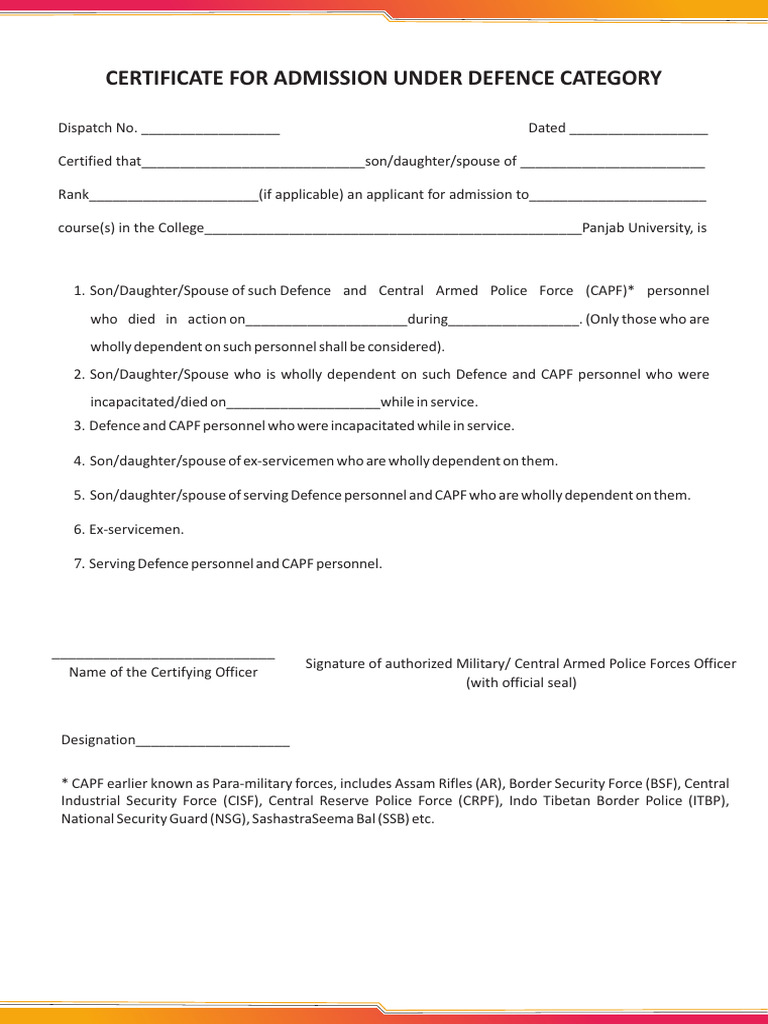 CERTIFICATE FOR ADMISSION UNDER DEFENCE CATEGORY