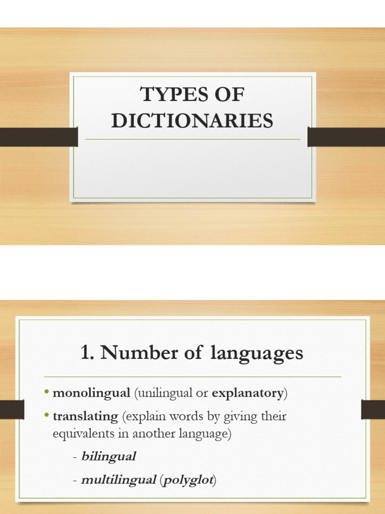 • the type of the units themselves (e. g. phraseological dictionaries)