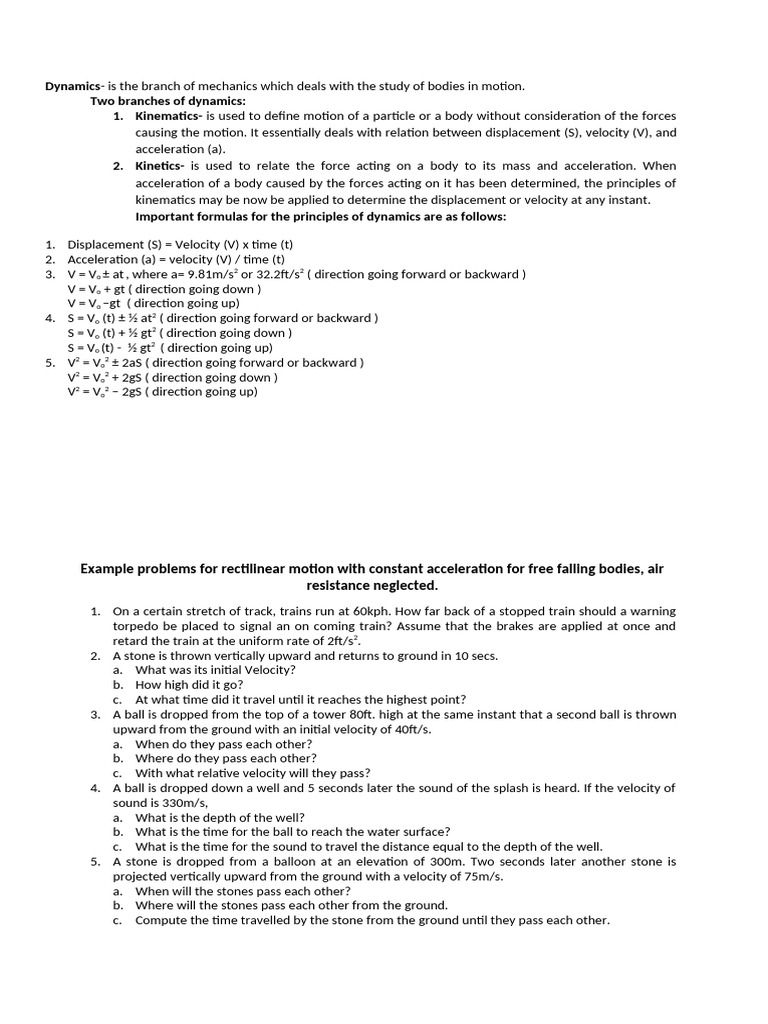 1. Kinematics- is used to define motion of a particle or a body without consideration of the forces