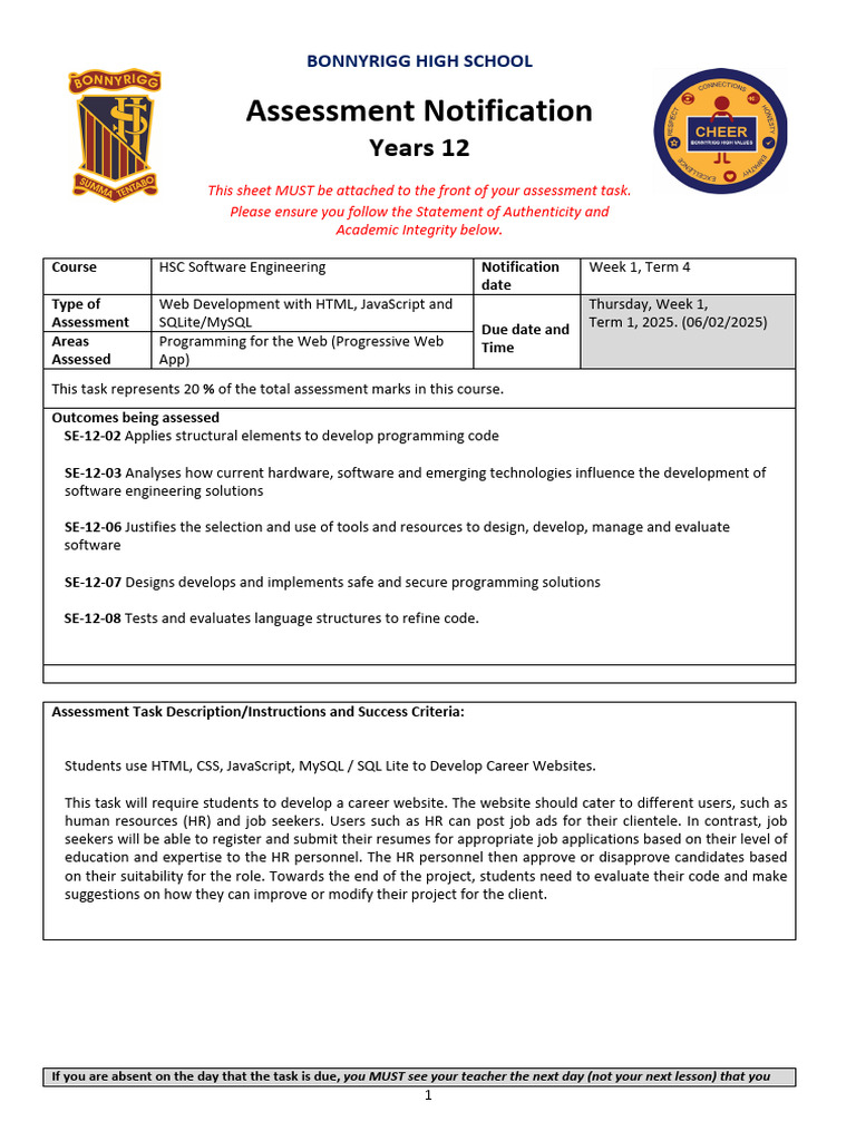 If you are absent on the day that the task is due, you MUST see your teacher the next day (not your next lesson) that you