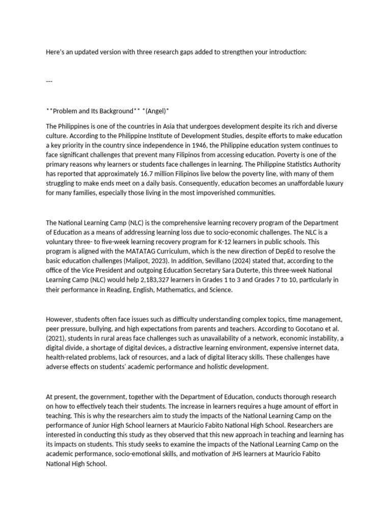 teaching. This is why the researchers aim to study the impacts of the National Learning Camp on the