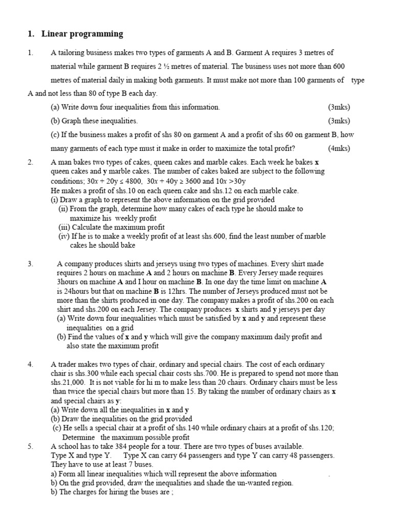Kshs.150 to make a pair of type B. His total cost does not exceed kshs.9000. He must make