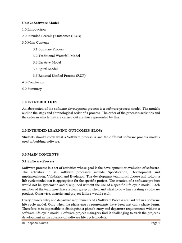 specific perspective. The models include Waterfall. Spiral, Iterative and RUP.