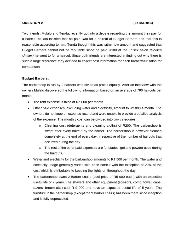 • The salon owns 7 Barber chairs (cost price of R5 000 each) and furniture (cost price