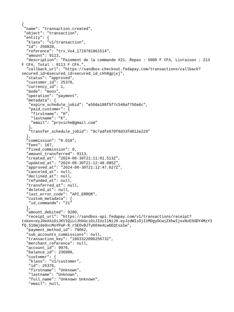 A transaction has been created with an ID of 250828, amounting to 9113 F CFA for order #21, which includes a meal and delivery fee. The transaction is approved and processed through the 'moov' payment method, with a callback URL provided for further actions. The customer associated with this transaction is identified as 'H K' with an email address of proviche@gmail.com.
