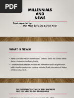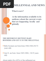 The document discusses millennials, defining their age range and characteristics, while contrasting them with other generations. It highlights their significant reliance on social media and technology, noting both the positive and negative impacts on their lives, including mental health issues and changes in communication. Additionally, it covers the evolution of technology and its effects on education, information access, and social interactions.
