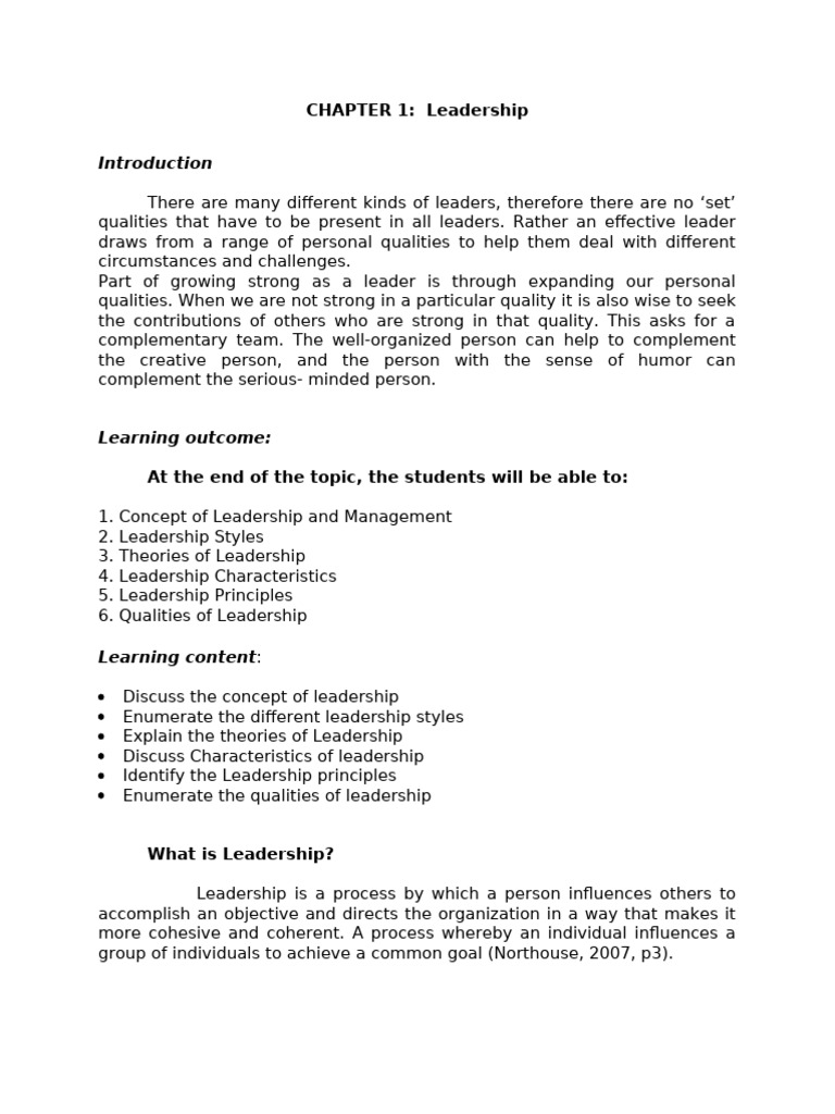 group of individuals to achieve a common goal (Northouse, 2007, p3).