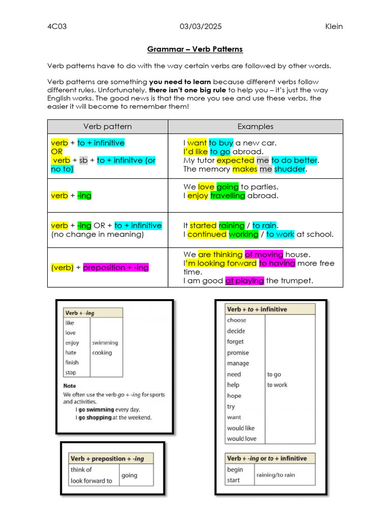 Verb patterns have to do with the way certain verbs are followed by other words.