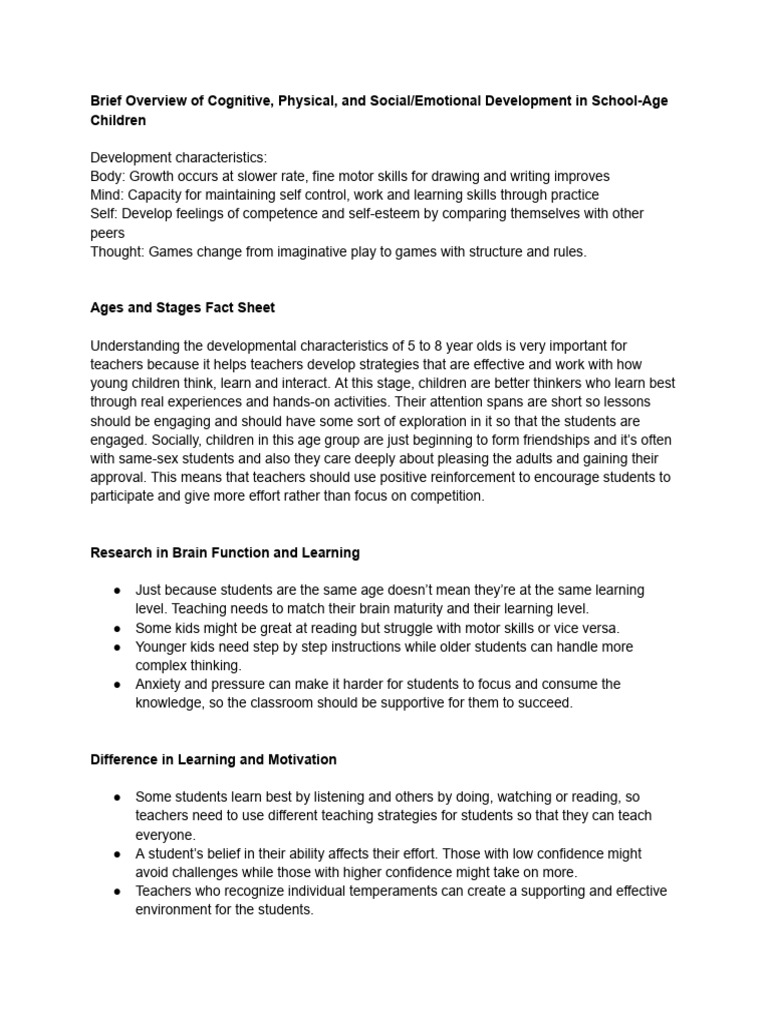 Brief Overview of Cognitive, Physical, and Social/Emotional Development in School-Age