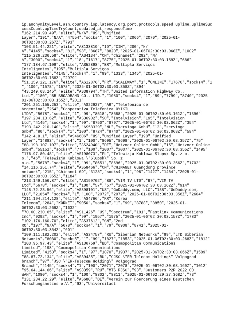 ip,anonymityLevel,asn,country,isp,latency,org,port,protocols,speed,upTime,upTimeSuc