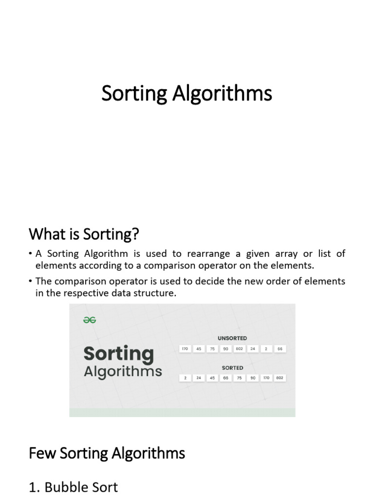 • A Sorting Algorithm is used to rearrange a given array or list of