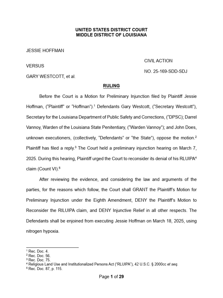 executing Jessie Hoffman on March 18, 2025, using nitrogen hypoxia. Plaintiff’s Motion