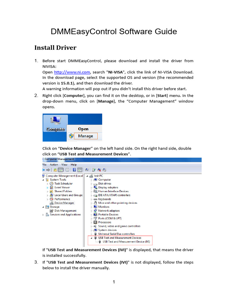 In Device Manager, check if "USB Test and Measurement Devices (IVI)" is