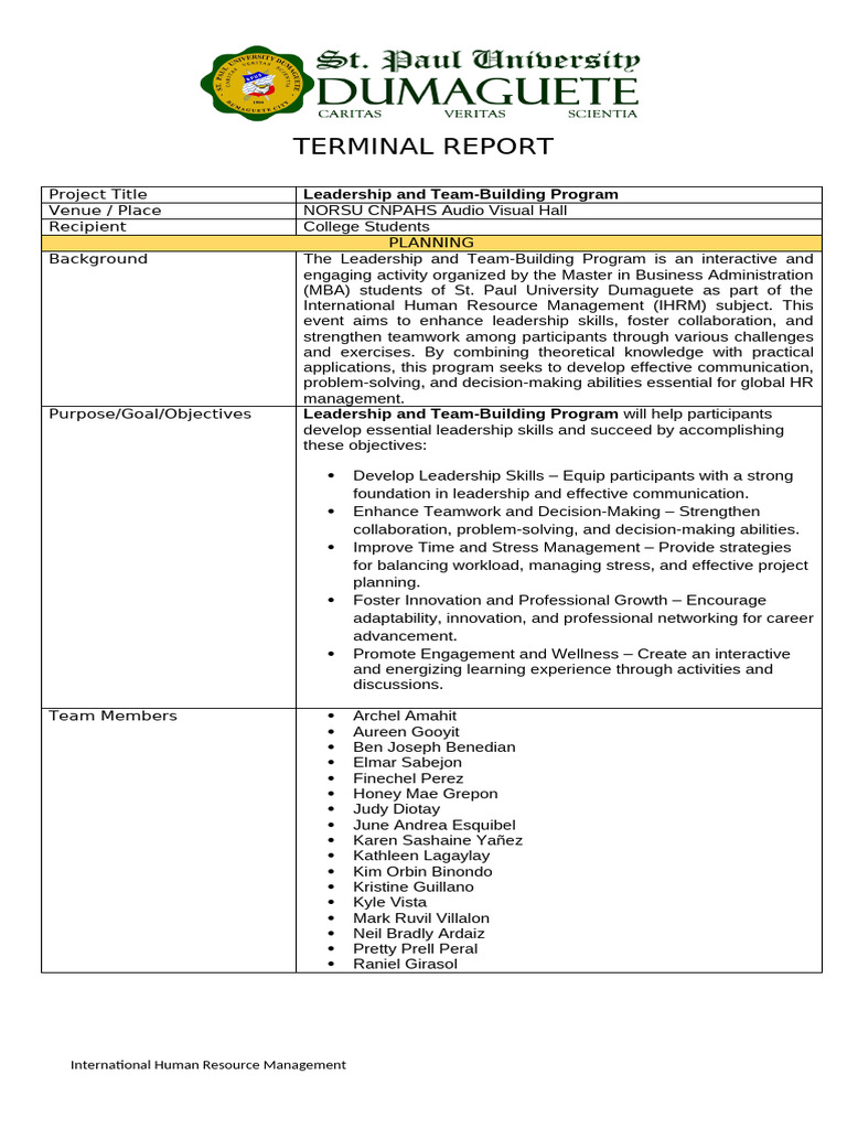 Purpose/Goal/Objectives Leadership and Team-Building Program will help participants