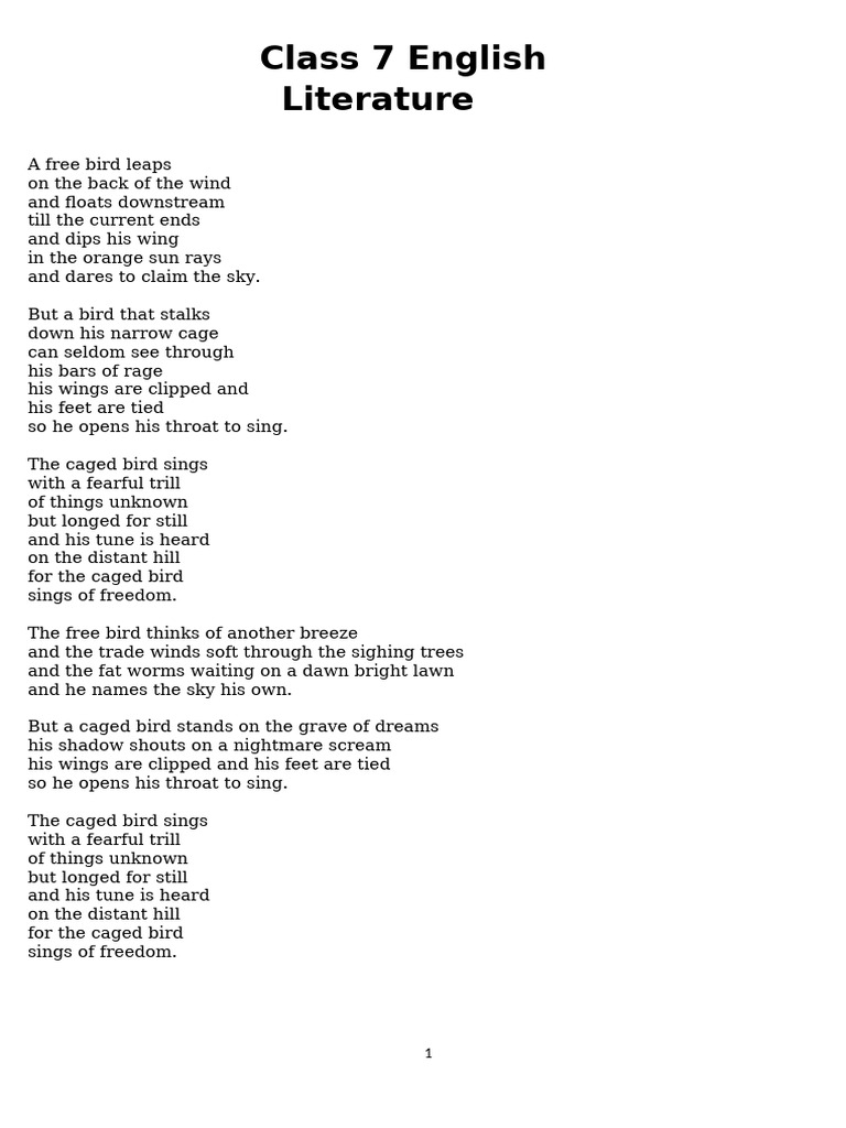 In terms of form, “Caged Bird” comprises six stanzas of free verse. The poem also uses an inconsistent rhyme