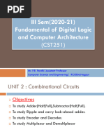 The document outlines the design of combinational logic circuits, including components such as adders, subtractors, and multiplexers. It details the design procedure, truth tables, and Boolean expressions for various circuits like half adders and full adders. Additionally, it covers the implementation of these circuits using logic gates and Verilog HDL modeling.