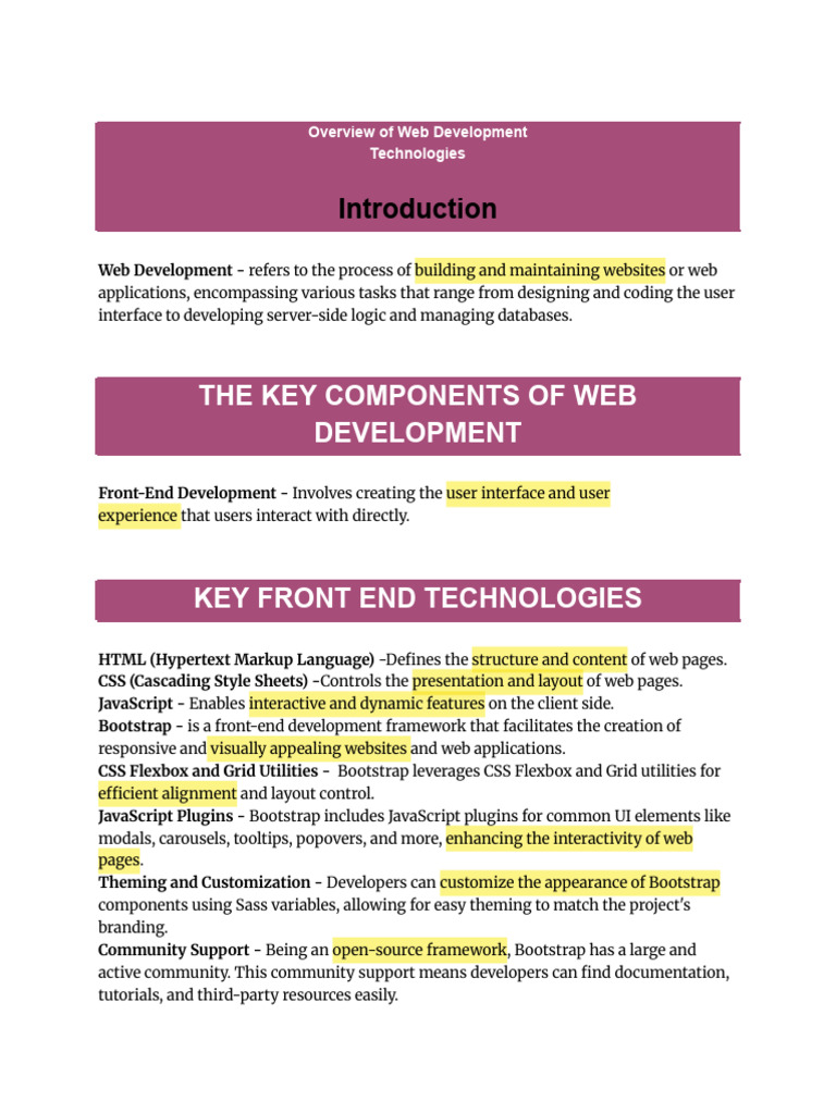 HTML (Hypertext Markup Language) -Defines the structure and content of web pages.