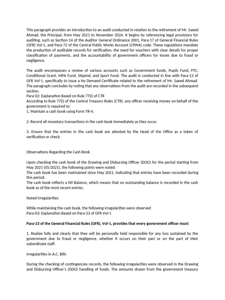 Ahmad, the Principal, from May 2021 to November 2024. It begins by referencing legal provisions for