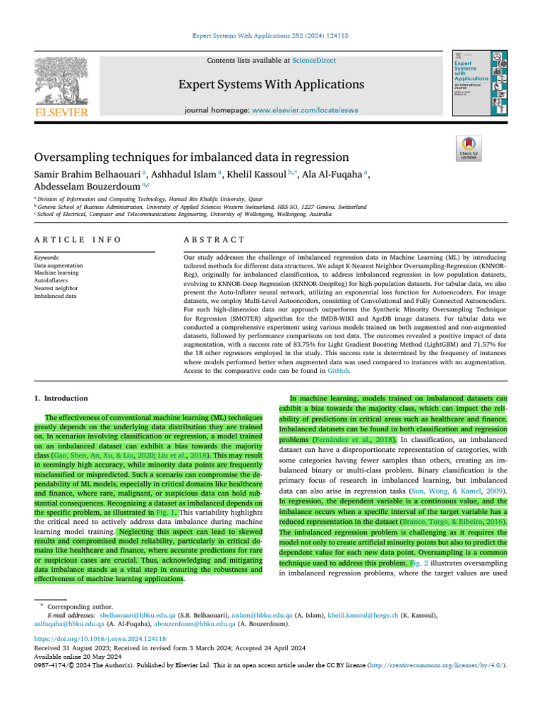 sampling (KNNOR) method (Islam, Belhaouari, Rehman, & Bensmail, examples have target values in a different range. This imbalance can