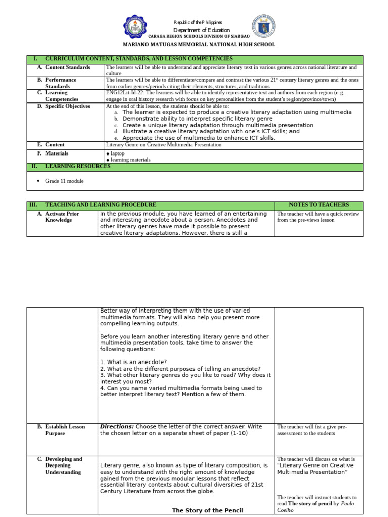 A. Content Standards The learners will be able to understand and appreciate literary text in various genres across national literature and