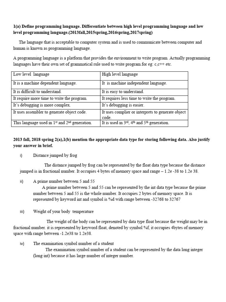 2013 fall, 2018 spring 2(a),1(b) mention the appropriate data type for storing following data. Also justify