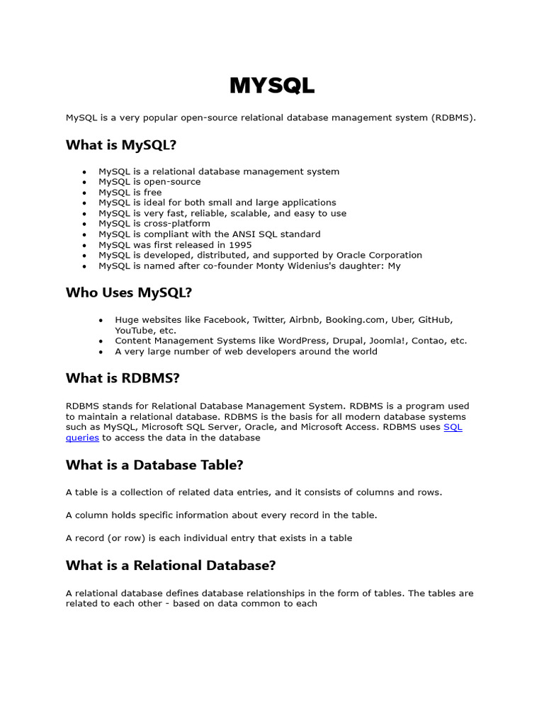 such as MySQL, Microsoft SQL Server, Oracle, and Microsoft Access. RDBMS uses SQL