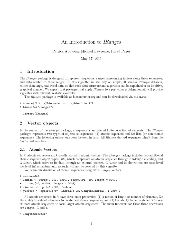 In the context of the IRanges package, a sequence is an ordered nite collection of elements. The IRanges packages represents two types of objects as sequences: (1) atomic sequences and (2) lists (or non-atomic sequences). The following subsections describe each in turn. All IRanges-derived sequences inherit from the Vector virtual class.