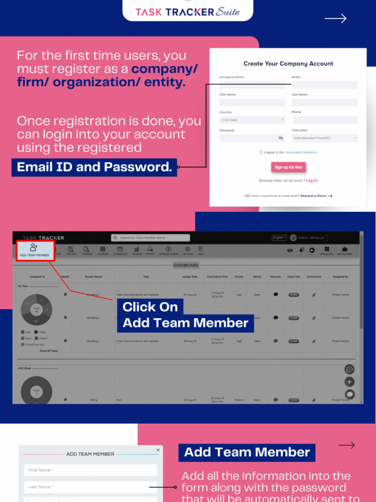 TRACKER Suite allows users to create company accounts, add team members, and manage tasks through various roles such as Manager, Assistant Manager, and Team Member. The platform includes features for task assignment, timesheet management, leave applications, and performance scoring, as well as communication tools like Zoom meetings and external alerts. Users can also view attendance records and manage team member details, ensuring efficient workflow and task tracking within the organization.