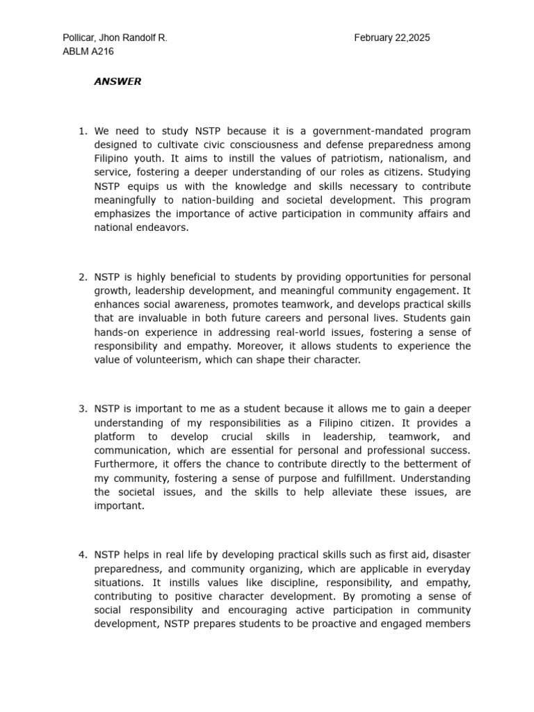 3. NSTP is important to me as a student because it allows me to gain a deeper