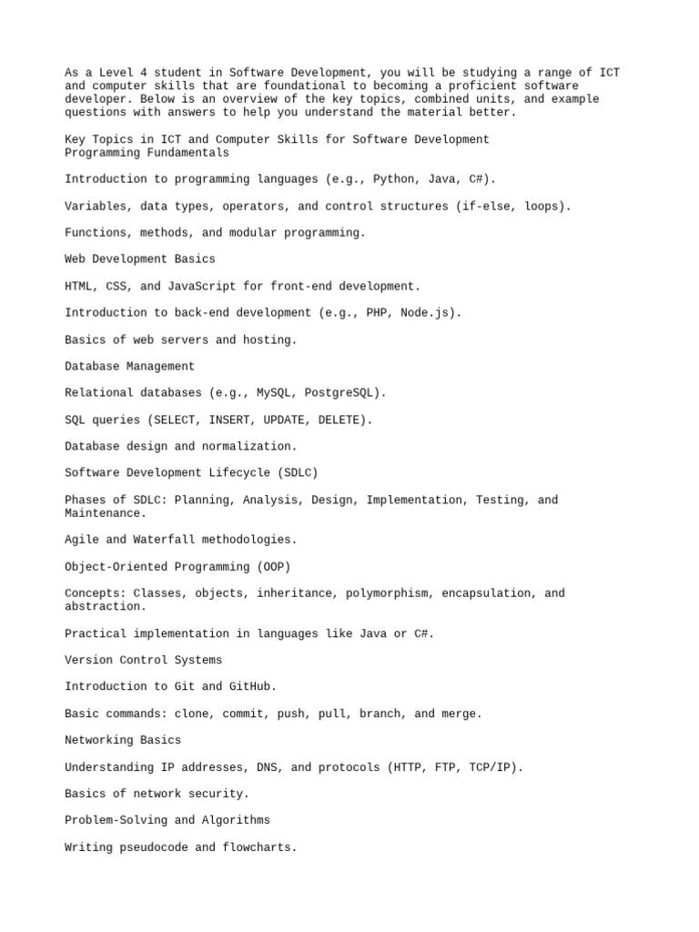 Key Topics in ICT and Computer Skills for Software Development