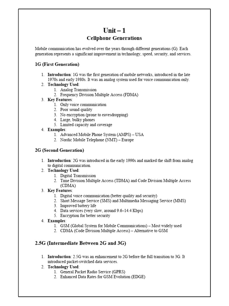 1. Introduction: 1G was the first generation of mobile networks, introduced in the late