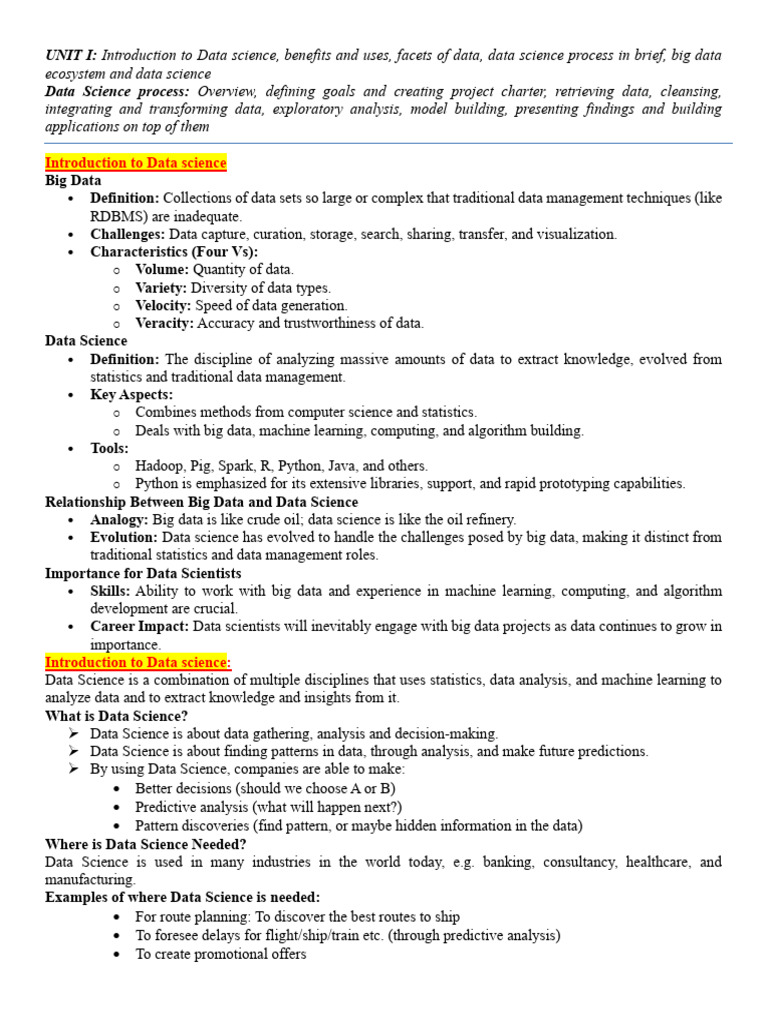 UNIT I: Introduction to Data science, benefits and uses, facets of data, data science process in brief, big data
