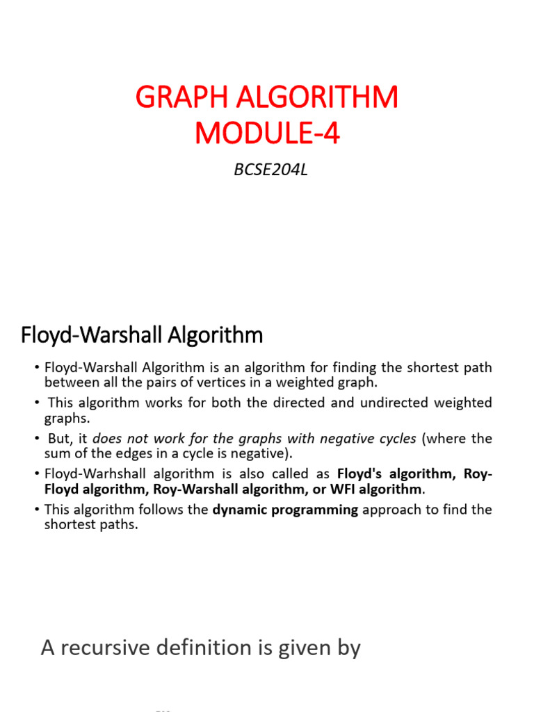 • Floyd-Warshall Algorithm is an algorithm for finding the shortest path
