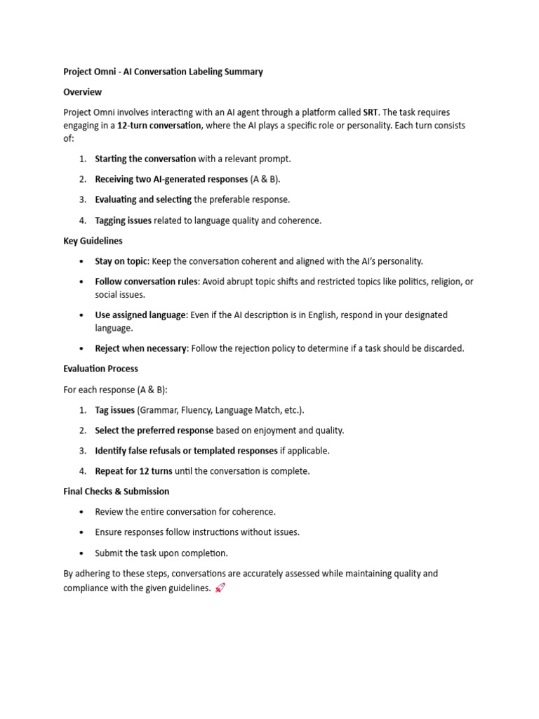 Project Omni involves interacting with an AI agent through a platform called SRT. The task requires