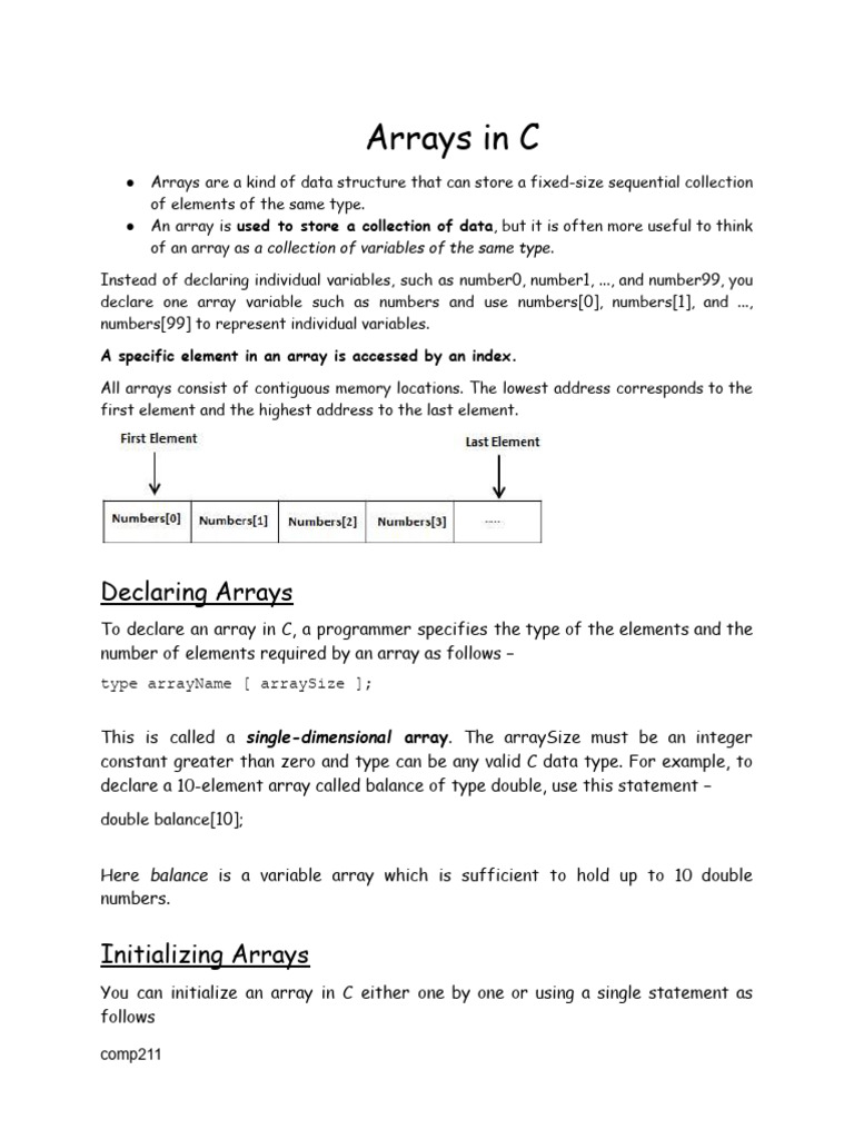 mentioned concepts viz. declaration, assignment, and accessing arrays −