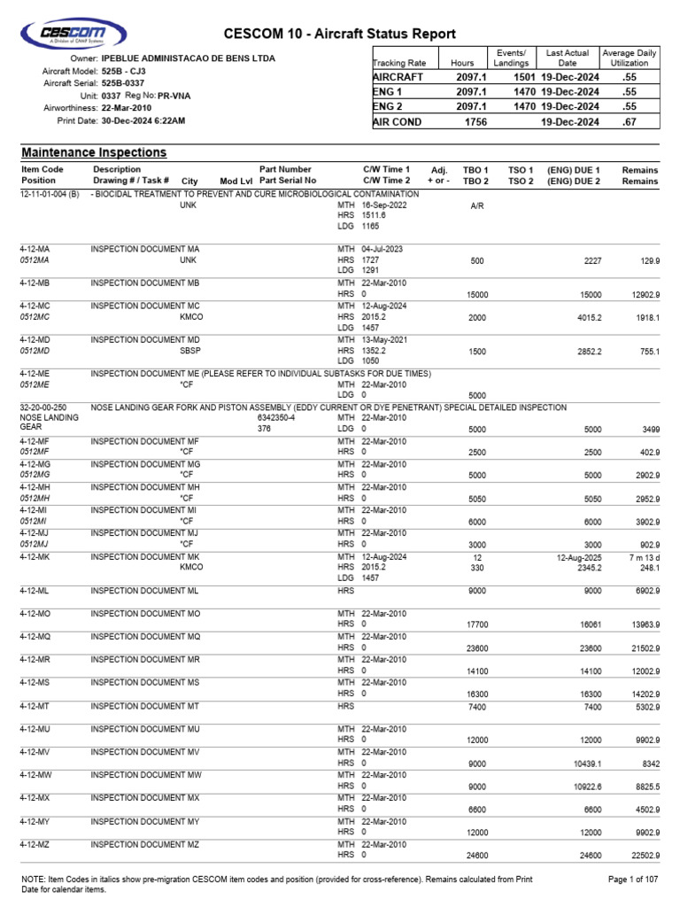 Owner: IPEBLUE ADMINISTACAO DE BENS LTDA Tracking Rate Hours Landings Date Utilization