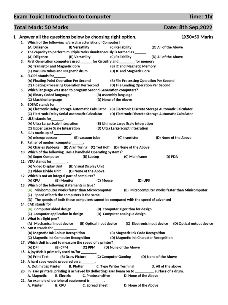 Exam Topic: Introduction to Computer Time: 1hr