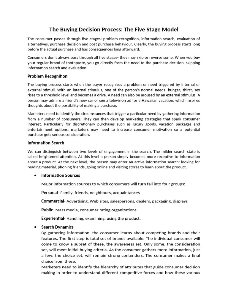 alternatives, purchase decision and post purchase behaviour. Clearly, the buying process starts long