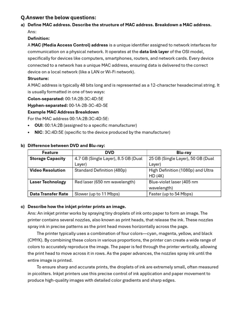 Ans: An inkjet printer works by spraying tiny droplets of ink onto paper to form an image. The