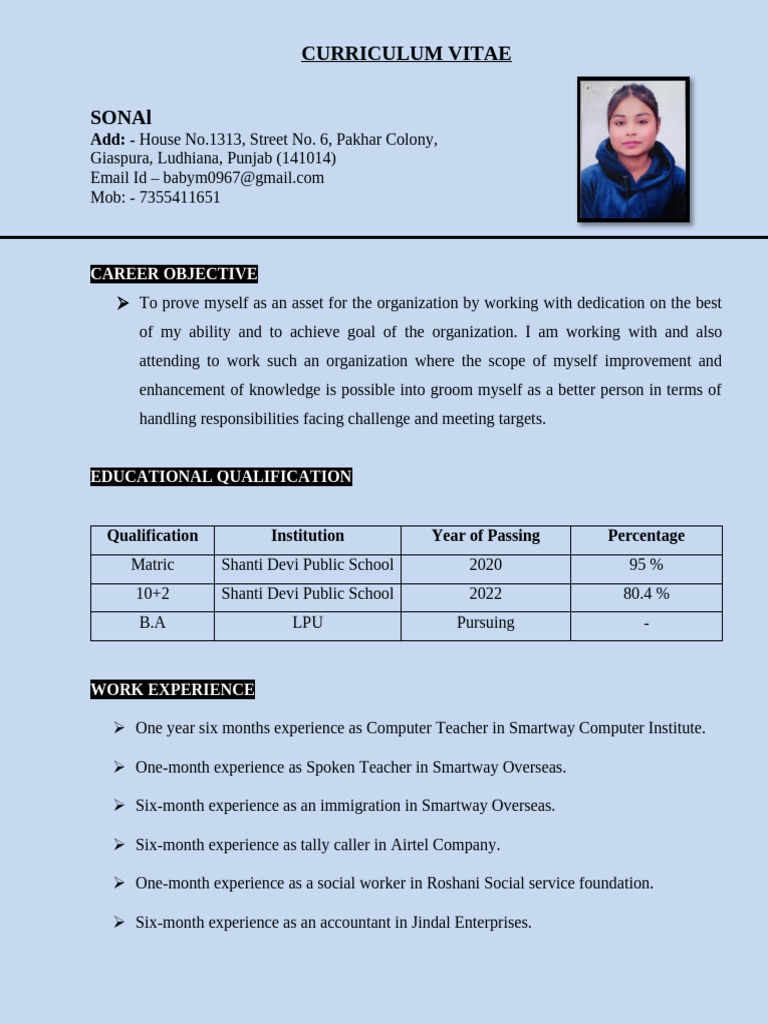One year six months experience as Computer Teacher in Smartway Computer Institute.