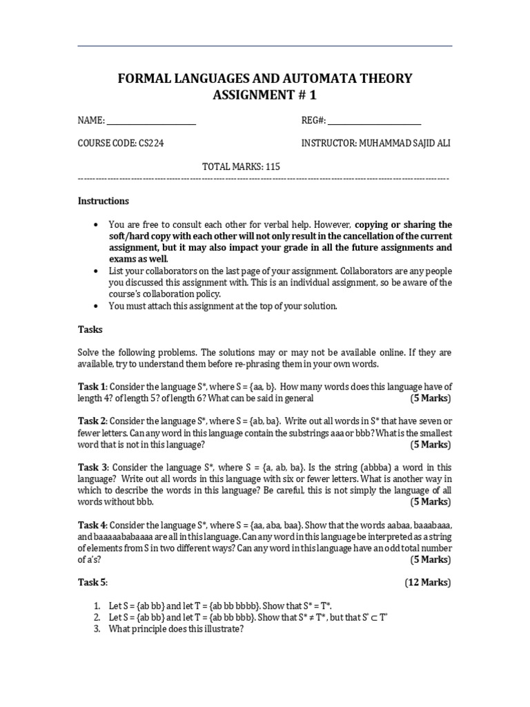 Task 4: Consider the language S*, where S = {aa, aba, baa}. Show that the words aabaa, baaabaaa,