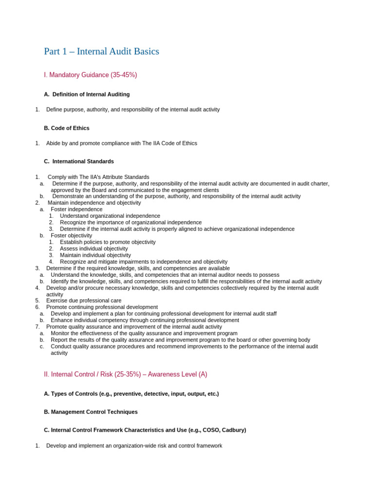 II. Internal Control / Risk (25-35%) – Awareness Level (A)