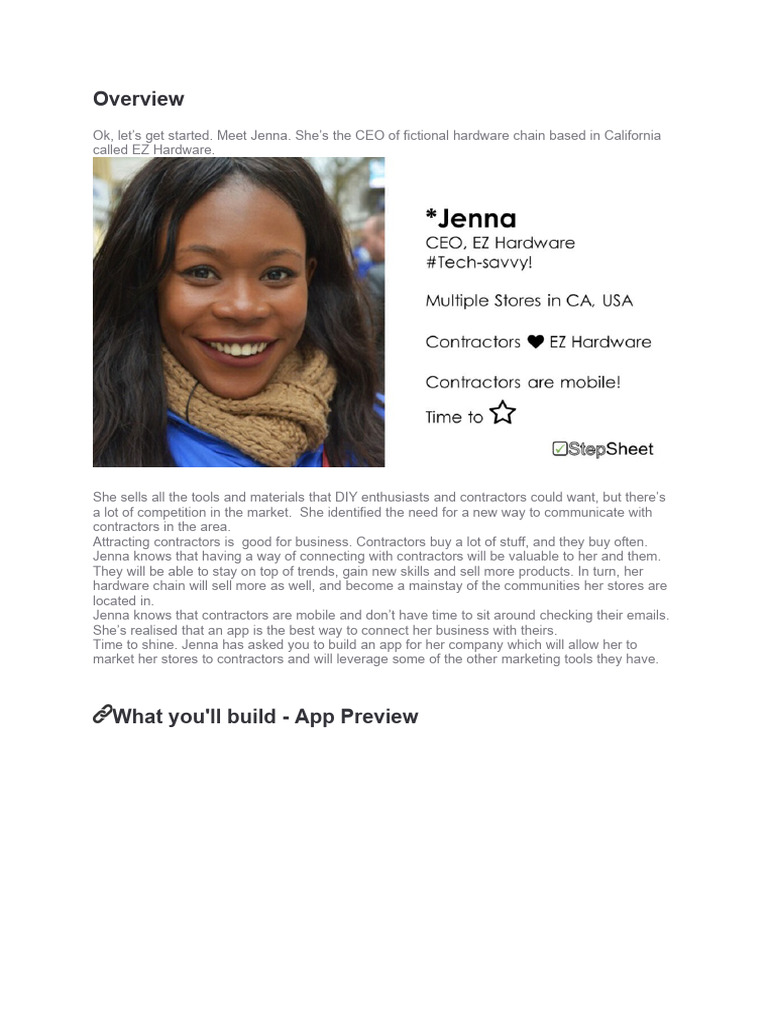 Time to shine. Jenna has asked you to build an app for her company which will allow her to
