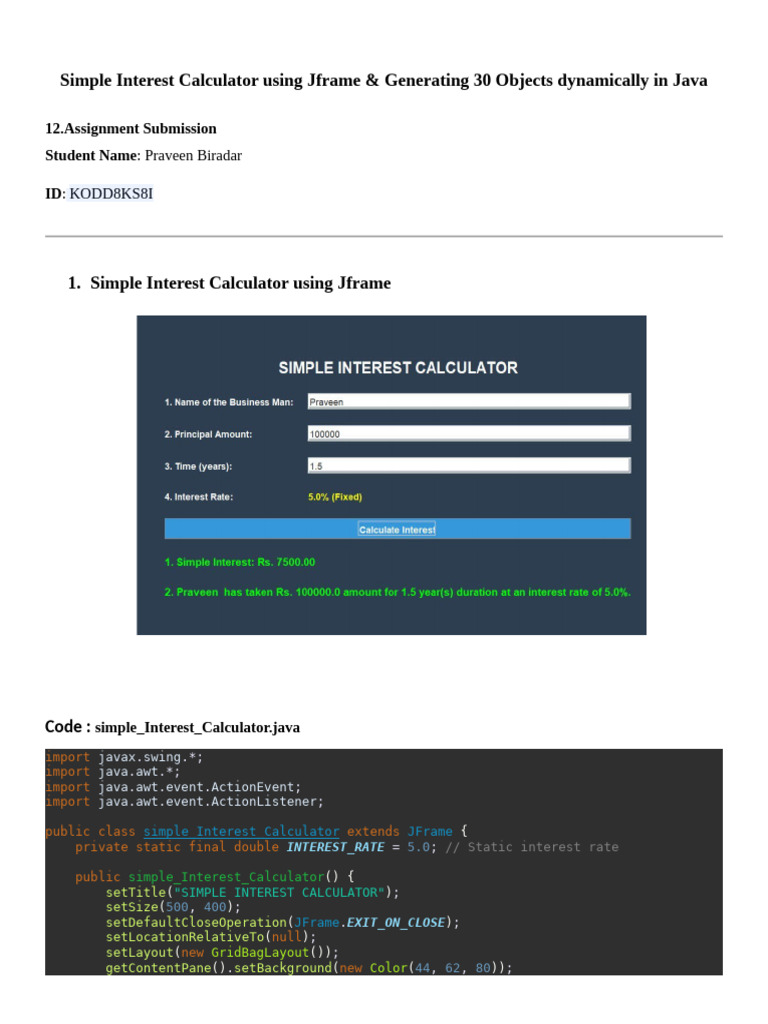 Simple Interest Calculator using Jframe & Generating 30 Objects dynamically in Java