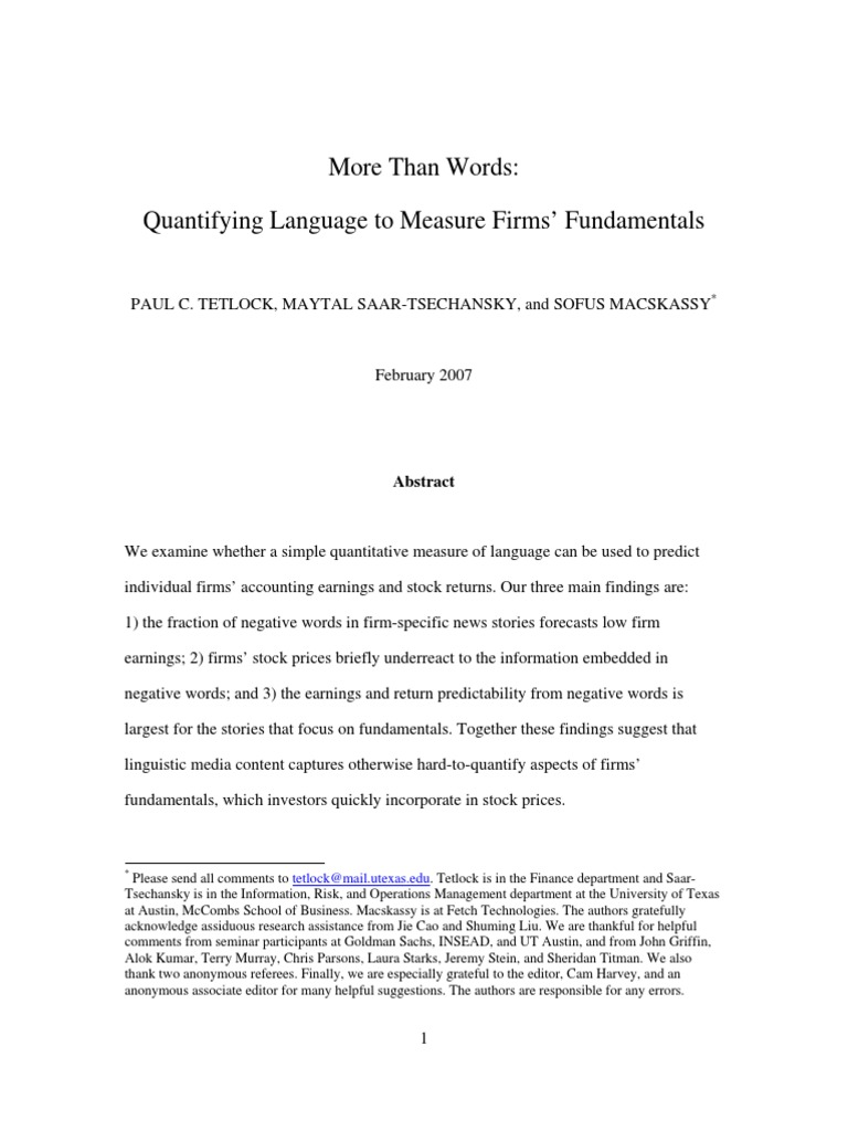 Please send all comments to tetlock@mail.utexas.edu. Tetlock is in the Finance department and Saar-
