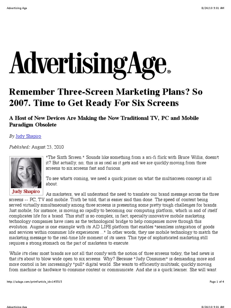 By Judy Shapiro Published: August 23, 2010 "The Sixth Screen." Sounds like something from a sci-fi flick with Bruce Willis, doesn't it? But actually, no; this is as real as it gets and we are quickly moving from three screens to six screens fast and furious. To see what's coming, we need a quick primer on what the multiscreen concept is all about. As marketers, we all understand the need to translate our brand message across the three screens -- PC, TV and mobile. Truth be told, that is easier said than done. The speed of content being served virtually simultaneously among three screens is presenting some pretty tough challenges for brands. Just mobile, for instance, is moving so rapidly to becoming our computing platform, which in and of itself complicates life for a brand. This stuff is so complex, in fact, specialty innovative mobile marketing technology companies have risen as the technological bridge to help companies move through this evolution. Augme is one example with its AD LIFE platform that enables "seamless integration of goods and services within consumer life experiences ..." In other words, they use mobile technology to match the marketing message to the real-time life moment of its users. This type of sophisticated marketing still requires a strong stomach on the part of marketers to execute. While it's clear most brands are not all that comfy with the notion of three screens today, the bad news is that it's about to blow wide open to six screens. Why? Because "Judy Consumer" is demanding more and more control in her increasingly "pull" digital world. She wants to efficiently multitask; quickly moving from machine or hardware to consume content or communicate. And she is a quick learner. She will want