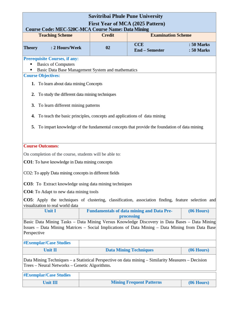 Course Code: MEC-520C-MCA Course Name: Data Mining