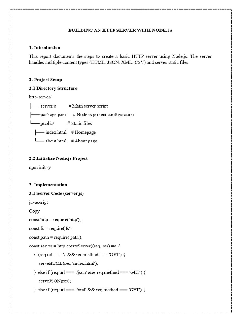 This report documents the steps to create a basic HTTP server using Node.js. The server
